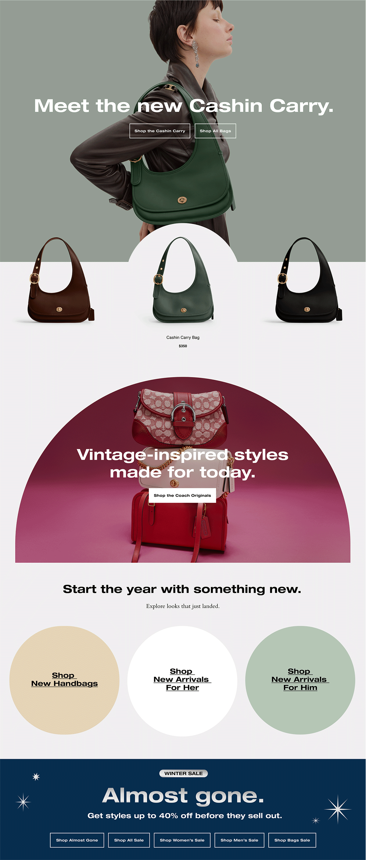 The Cashin Carry Cresent Bag is a re-edition of a 1973 bestseller. The brief for this launch asked to reintroduce this gorgeous style from the archive, bringing it to life for the modern day Gen Z customer. Following this directive, I featured this iconic on-figure shot that fit the look of the target customer and flooded the background in a muted green to showcase the bag. Below, I added in a 360 view of the Cashin Carry for the customer to get a sense of its wholistic look and feel. Because it comes in classic shades of brown and black, I balanced out the page by including those shades for the more color conservative shoppers.