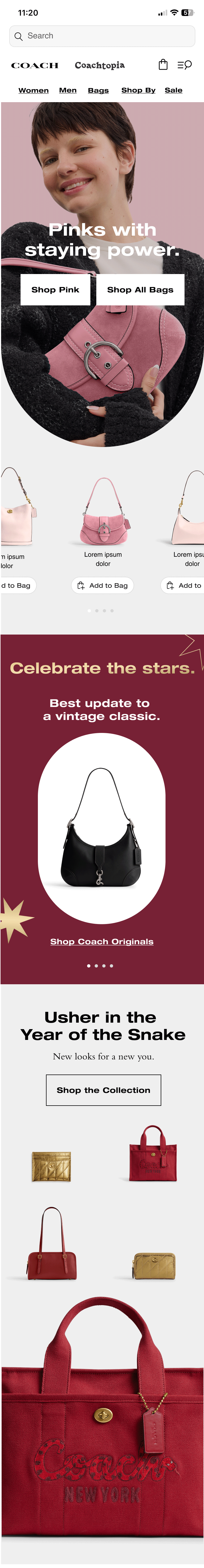 The brief for this site flip spoke to planting the seed of wishlisting fun new things before the valentine’s day launch. I chose to feature one of our favorite Gen Z on-figure models and flooded the background in a muted pink to showcase the bag. The client wanted to test a new feature, Add to Bag, below so I added in skus in a variety of pinks to represent the story: pinks with staying power. This page design did so well, we had to replace the hero image halfway through the flip run date as the suede bag sold out.